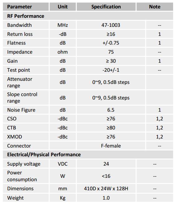 The GSDT-STA provides amplification of forward path RF signals in headend or hub locations. It uses a RF amplifier integrated circuit to provide high linearity, low-noise, and low distortions. It can adjust the integrated attenuator to obtain specific RF output levels, and it can easily compensate high-frequency roll-off due to headend cabling with the integrated slope control.